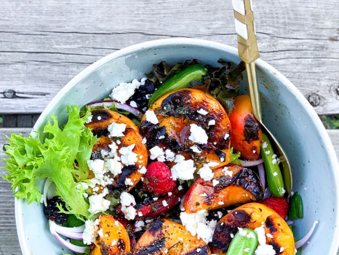 Grilled peach salad Easy and very very delicious summer salad with warm peaches and crispy greens😋😋😋 Dressing: 1/2tbsp olive or grape...